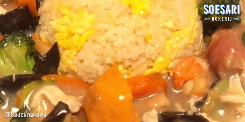 Terakhir, sajikan nasi siram yang sudah dicetak bersama dengan bahan lauk utama dan pendampingnya serta beri siraman kuah diatasnya