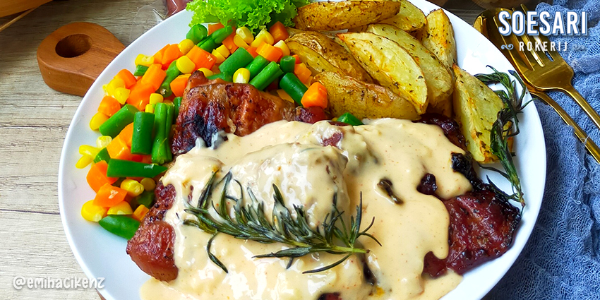 Tata ayam di piring, siram dengan saus keju + tambahkan topping sayur rebus dan kentang wedges