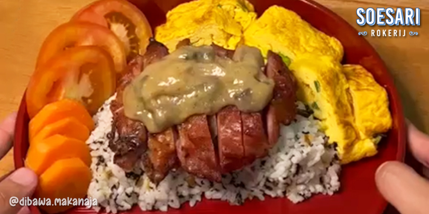 5. Siapkan piring, sajikan nasi putih dengan nori tabur, potongan telur, irisan tomat dan wortel lokal, potongan Smoked Chicken, serta Mushroom Sauce diatasnya