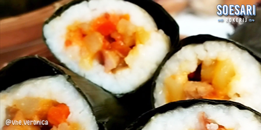 5. Kemudian, siapkan daun pisang dan susun nasi bersama isiannya. Gulung dan rekatkan dengan tusuk gigi