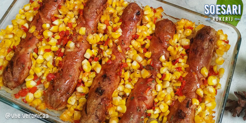 Setelah matang, keluarkan dari oven dan Baked Sausage & Rice with Corn siap disajikan.