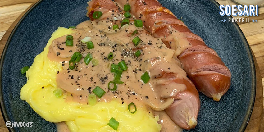 Pan frying sosis sapi keju hingga kecoklatan, setelah itu sisihkan