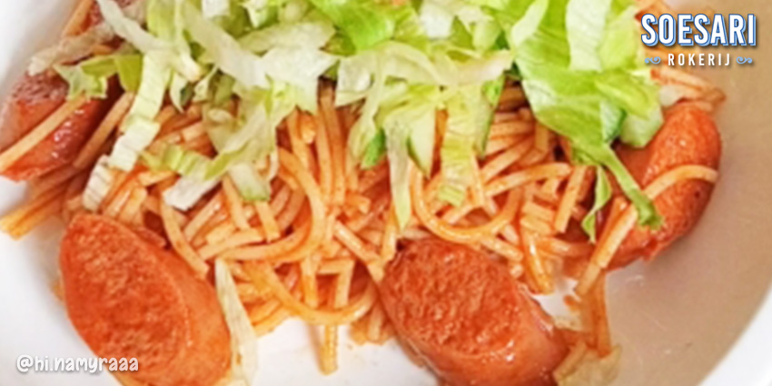 5. Siapkan piring favorit untuk plating, masukan spaghetti dan sosis lalu campurkan secara merata dengan saus yang sudah siapkan. letakan sayur yang sudah dipotong-potong sebagai pelengkap.
