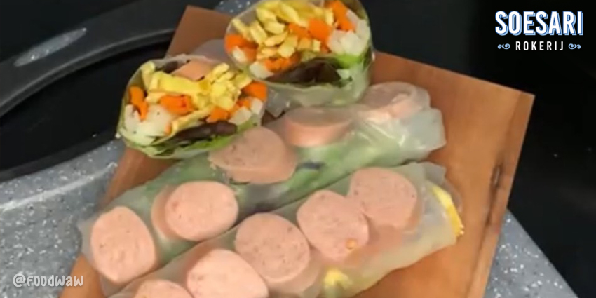Susun Rice Paper, kemudian tambahkan potongan Wortel, Bengkoang, Daun Salada, Telur dan juga Sosis . Setelah itu taburkan Ebi di atasnya secukupnya lalu lipat