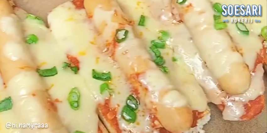 Belah dua roti baguette, olesi dengan margarin dan saus bolognese sampai rata. Beri Sosis Ayam Keju, daun bawang, dan parutan keju mozarella di atasnya