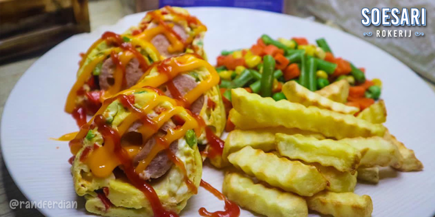 Sausage Egg Roll siap di sajikan bersama Sayuran dan Kentang Goreng