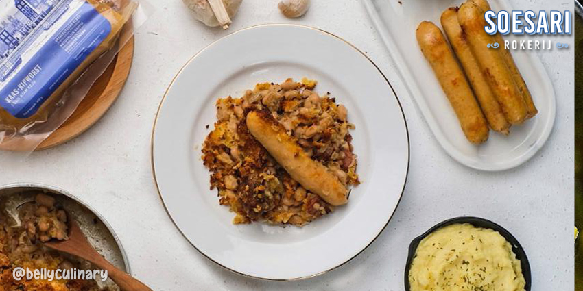 Tambahkan sosis ayam keju, daging sapi dan daging bebek dan kaldu ayam. Rebus kurang lebih selama 5 menit. Setelah itu sisihkan ke dalam baking dish