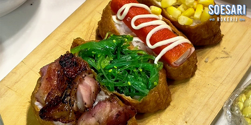 4. Siapkan 4 lembar inari skin, lalu isi dengan nasi sushi yang sudah dibumbui sebelumnya