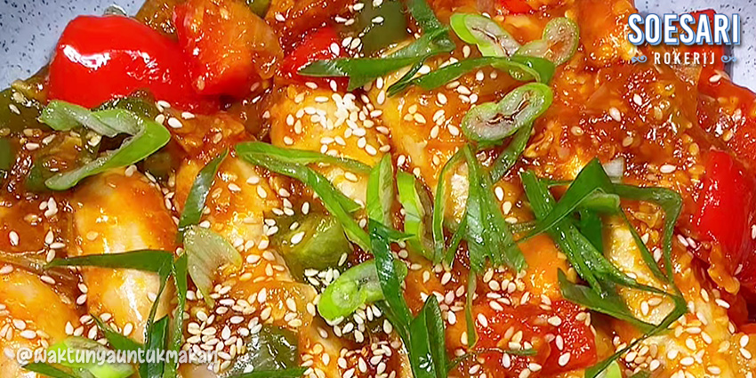 Panaskan pan anti lengket, beri sedikit minyak lalu masukkan Sosis Ayam Keju Soesari Rokerij, potongan bawang bombay, paprika merah, paprika hijau, serta campuran saus yang sudah disiapkan