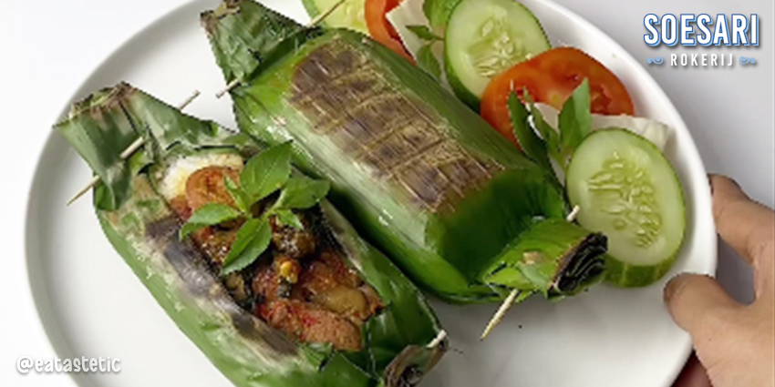 Siapkan daun pisang, tambahkan nasi yang sudah matang dan beri tumisan sosis sapi panggang dan jamur champignon. Lipat dengan tusuk gigi dan panggang di atas teflon sampai kecoklatan