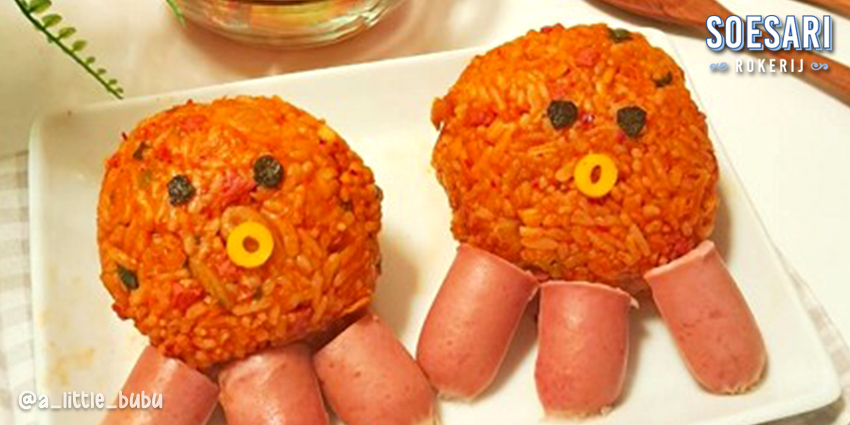 • Sajikan bentuk bulatan nasi, lalu tambahkan cetakan nori dan keju slice untuk bentuk mata dan mulut gurita