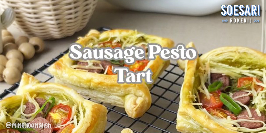 • Keluarkan Puff Pastry yang sudah dipanggang dan tambahkan isian berupa Bumbu Pesto, Sosis Sapi Panggang Soesari Rokerij, Tomat Cherry Organik Third Day, dan juga Keju Parut