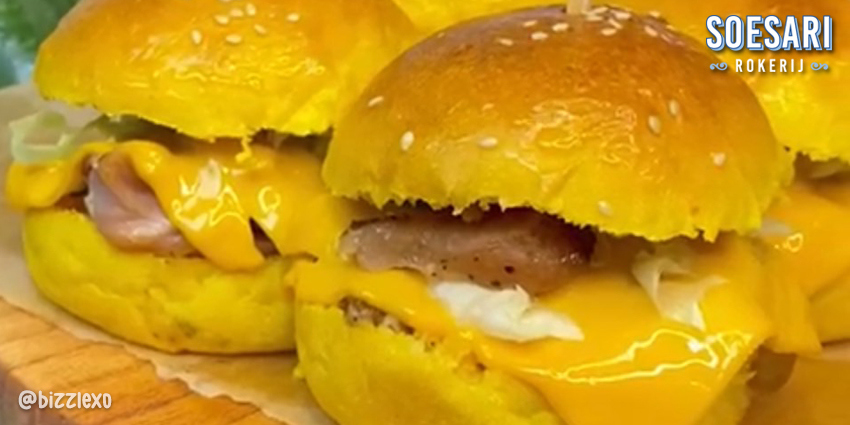 6. Siapkan roti (homemade pumpkins bun), belah menjadi 2 bagian. Kemudian tambahkan daging asap, mushrooms, bawang bombay, saus mayonnaise, keju kemudian lelehkan. Setelah itu tambahkan selada, timun, lalu tutup slidersnya