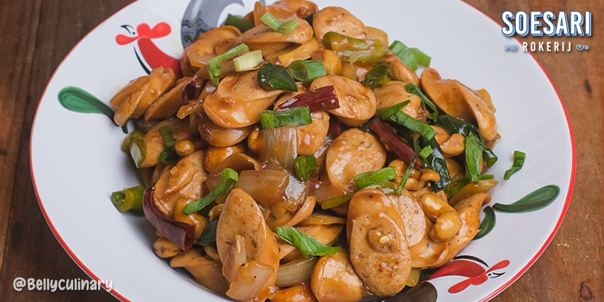 3. Oseng bawang bombay, jahe, cabe kering, bawang putih dan daun bawang. Kemudian disusul masukan sosis serta bumbu tadi, aduk sampai merata. Lalu tambahkan kacang mede dan masak sampai matang.