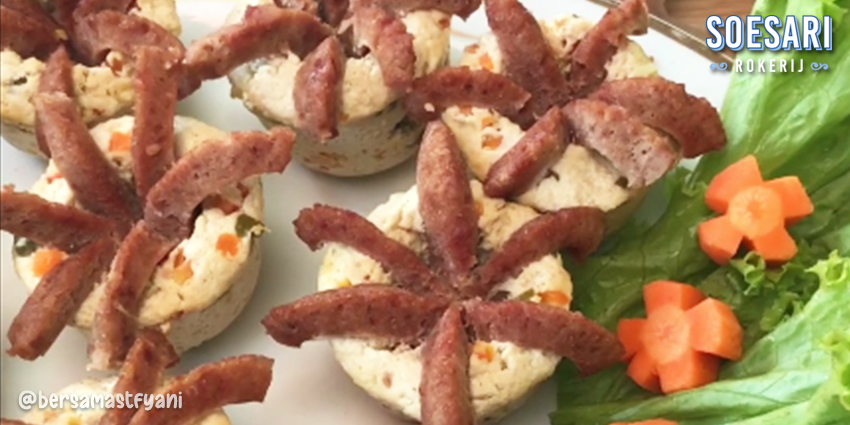 3. Iris ujungnya menjadi 6 bagian. Setelah itu, siapkan mangkuk kecil dan dicetak serta beri irisan sosis diatasnya